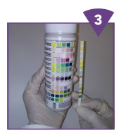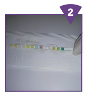 نوار را برای مدت (حداکثر) ۲ ثانیه در ادرار غوطه ور کنید. تمام مناطق واکنشی نوار را خیس کنید. نوار را بیرون بیاورید.
