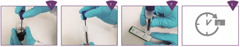 ۳- با شدت مخلوط کنید. درپوش قرمز لوله بافر را باز کنید و ۲ قطره نمونه رقیق شده را به داخل چاه نمونه (S) کاست منتقل کنید.
